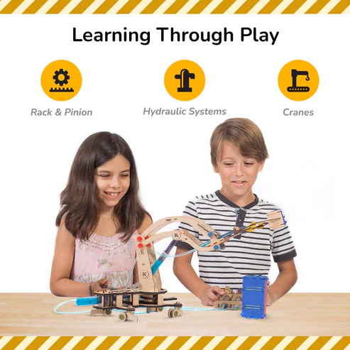 The magic of hydraulics is simple: you push one lever, something else moves. Kids see hydraulics every day — in garbage trucks, JCB machines, lifts, and cranes — but they don’t always understand how it all works.